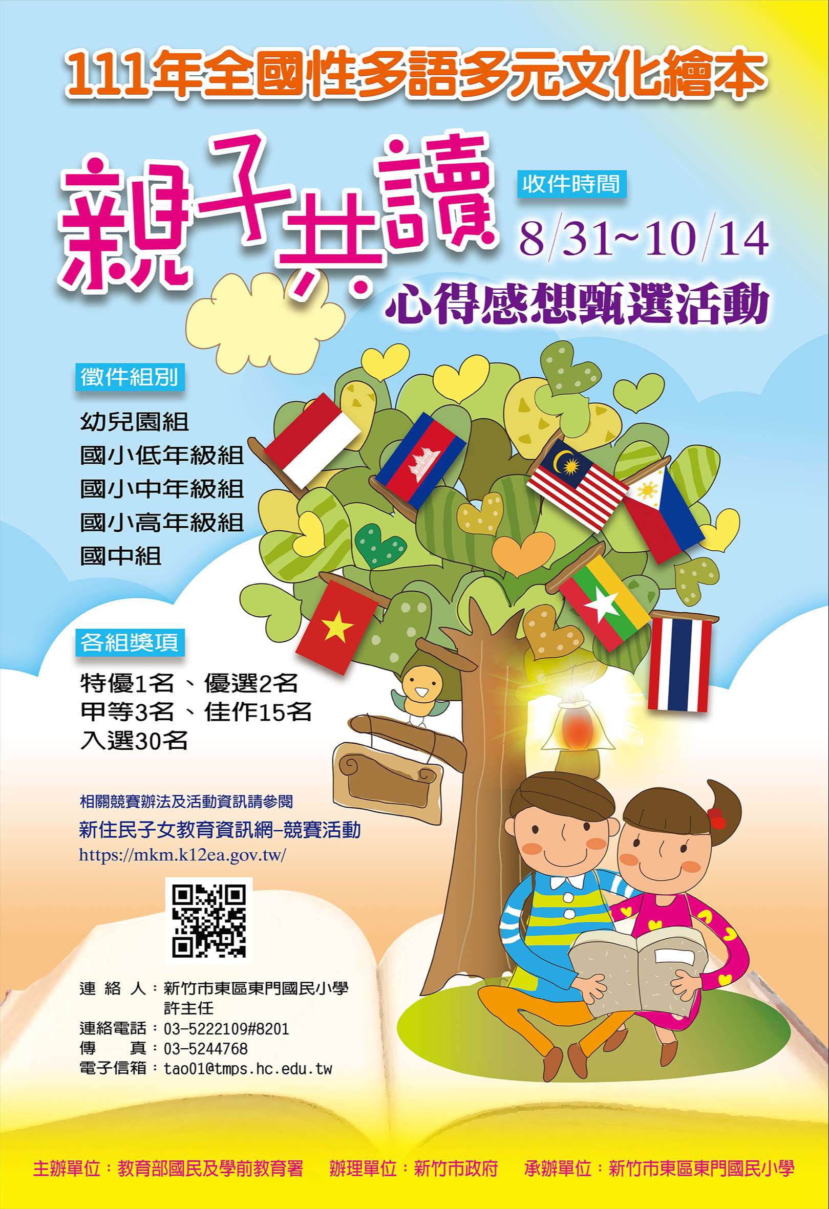 2、學校寄送授權同意書:請學校協助報名學生由該系統 下載著作權授權同意書填寫後寄至承辦學校新竹市東 區東門國小(新竹市東區民族路33號),註明參加111 年度全國性多語多元文化繪本親子共讀心得感想甄選 活動。