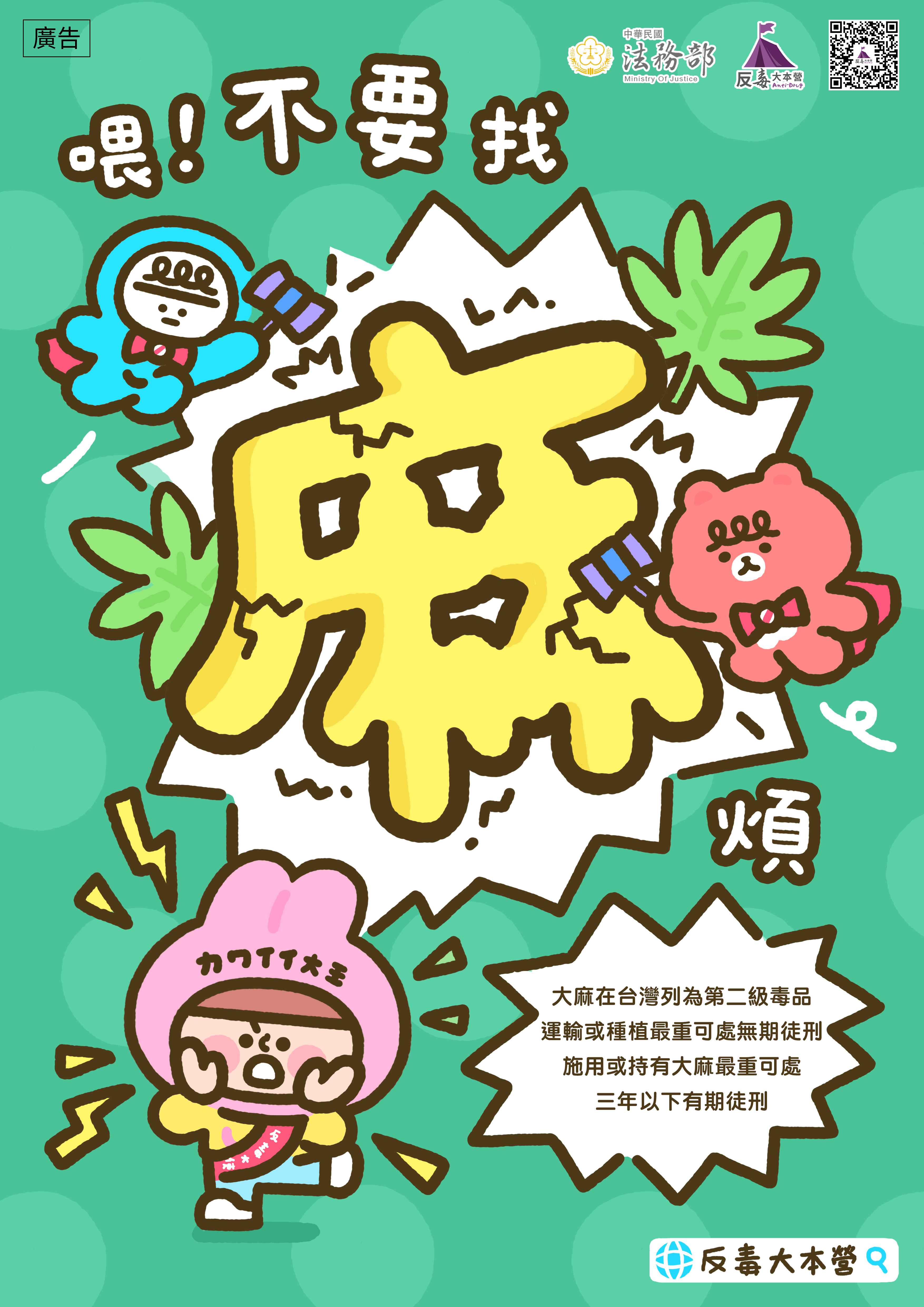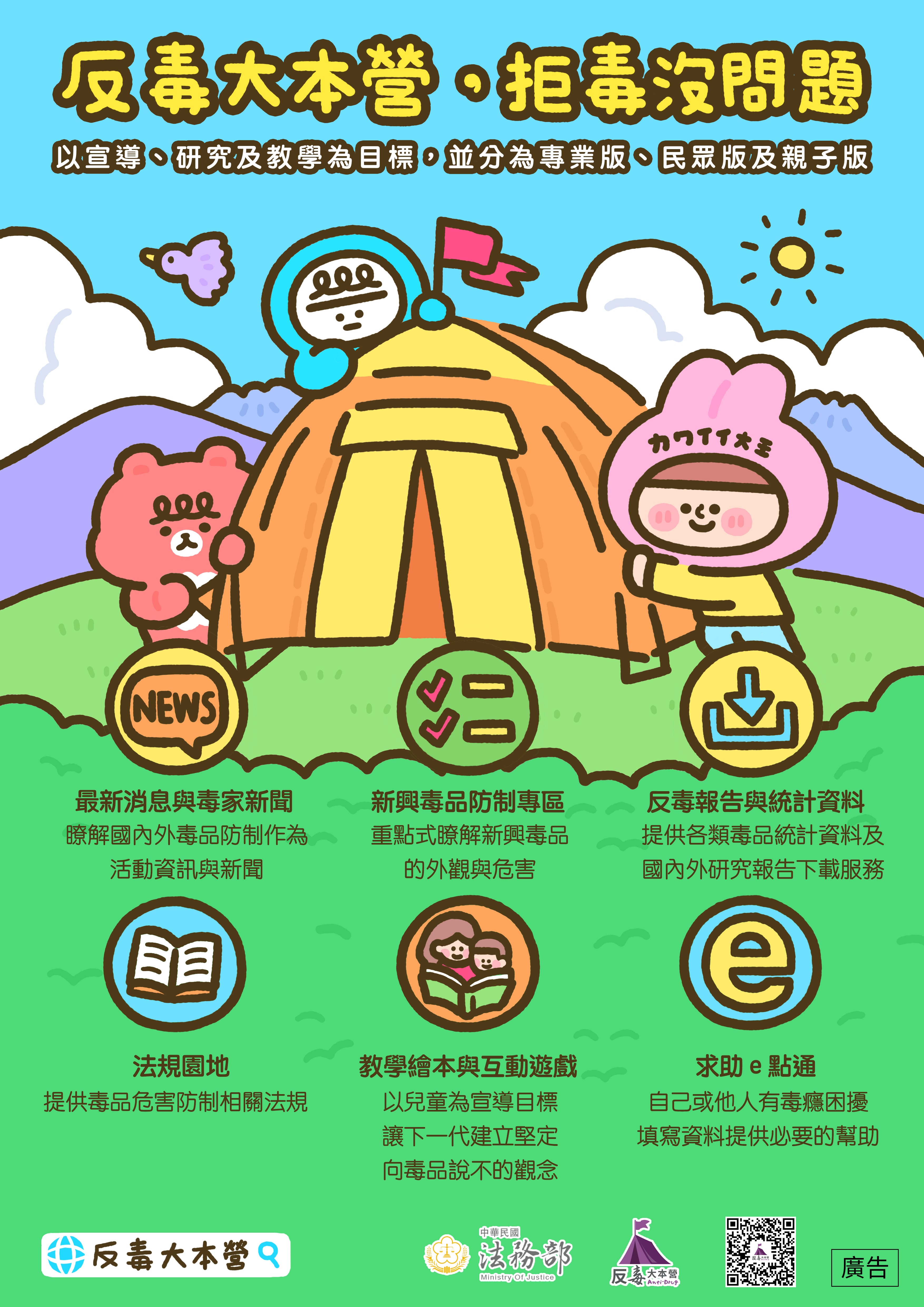 三、5款平面文宣建置於反毒大本營網站(反毒知識宣導/文宣 品/平面文宣,網址:https://reurl.cc/WqMvAZ)。