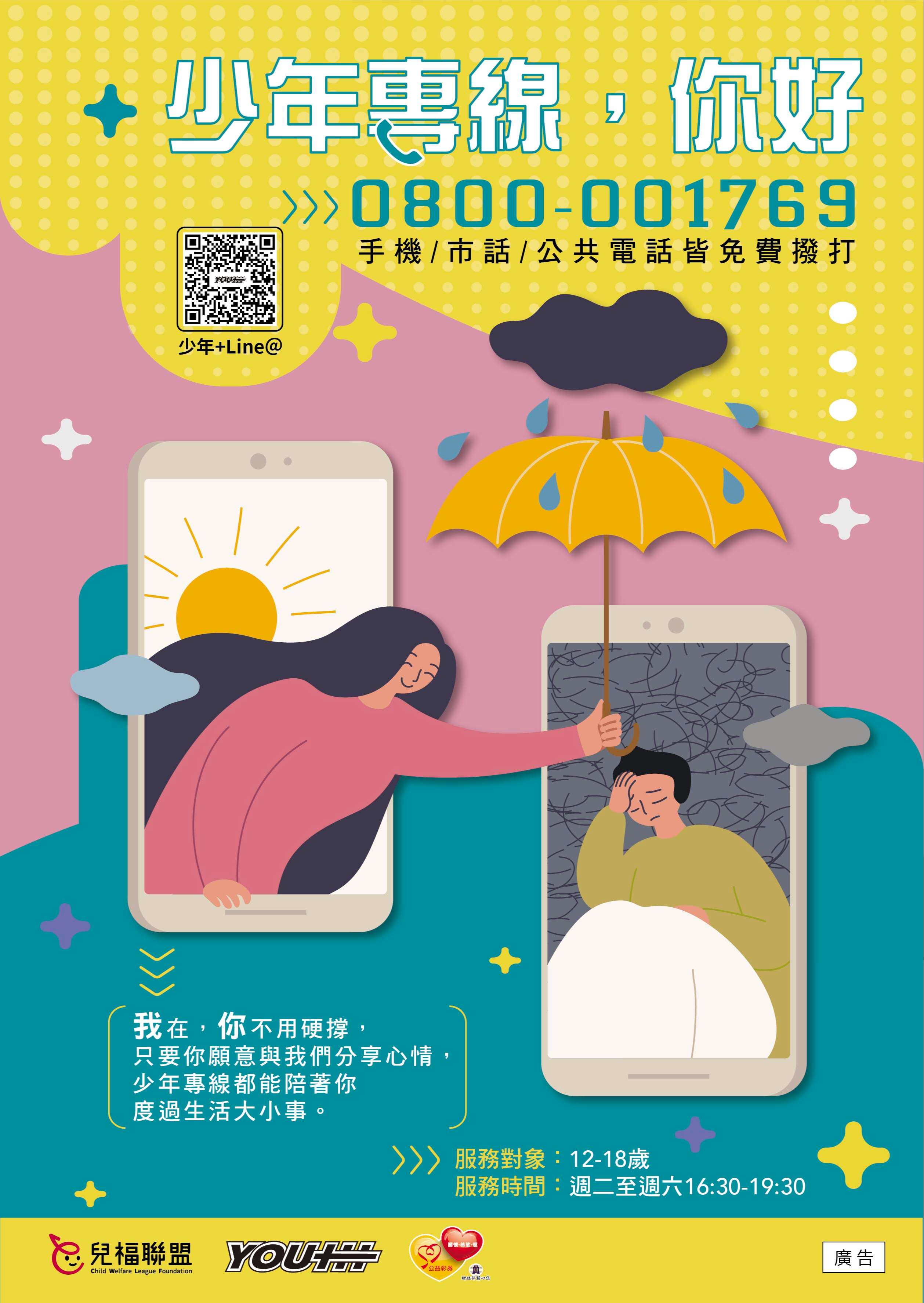 提供全台12歲至18歲之少年免付費電話諮詢服務,服務時 間為每週二至週六下午4:30至7:30。