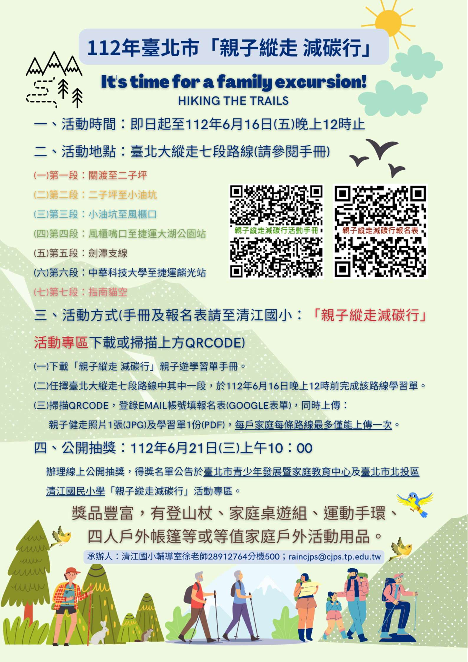 五、本活動訂於112年6月21日(星期三)上午10時辦理線上公 開抽獎,得獎名單公告於臺北市青少年發展暨家庭教育中心網站及臺北市北投區清江國民小學「親子縱走減碳行」 活動專區。倘有疑義,請洽臺北市北投區清江國民小學輔 導室徐老師,電話:02-28912764轉500;Email: raincjps@cjps.tp.edu.tw。