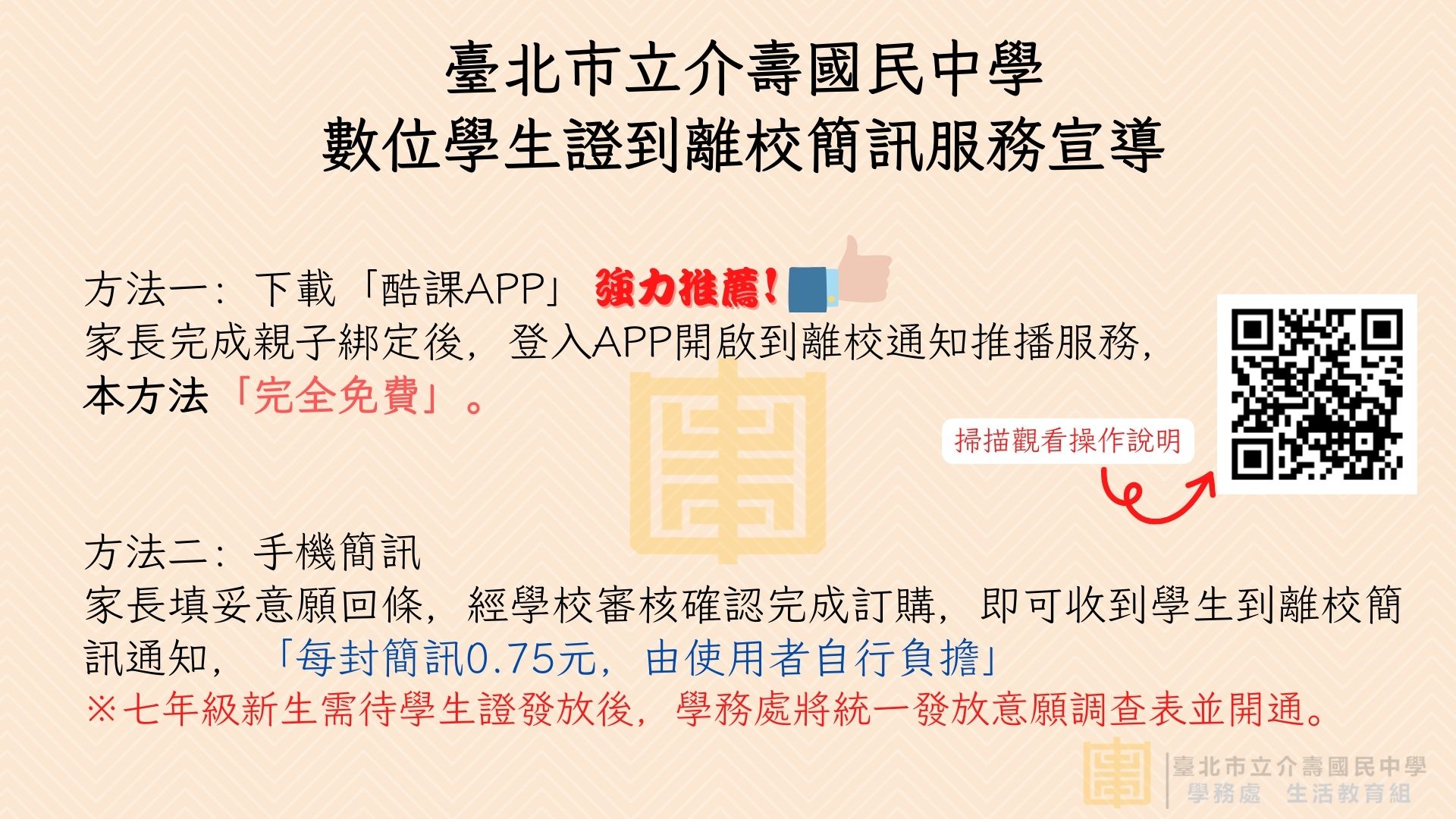 說明:家長完成親子綁定後,登入APP開啟到離校通知推播服務,本方法「完全免費」。(相關說明詳見 https://reurl.cc/vW6rVj )