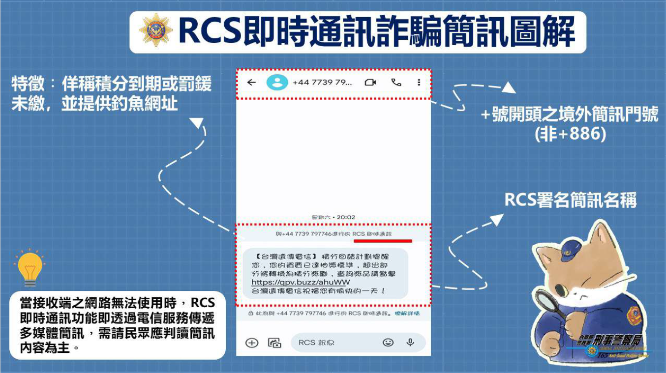 一、近期Android手機用戶成為詐騙集團的目標,此類手法主要 利用Google的RCS即時通訊功能,大肆發送常見的「積分即 將到期」及「罰款尚未繳納」詐騙訊息,並附上連結,一 旦點擊連結,會被引導至詐騙網站,並誘騙輸入信用卡資 訊,信用卡旋即遭盜刷。