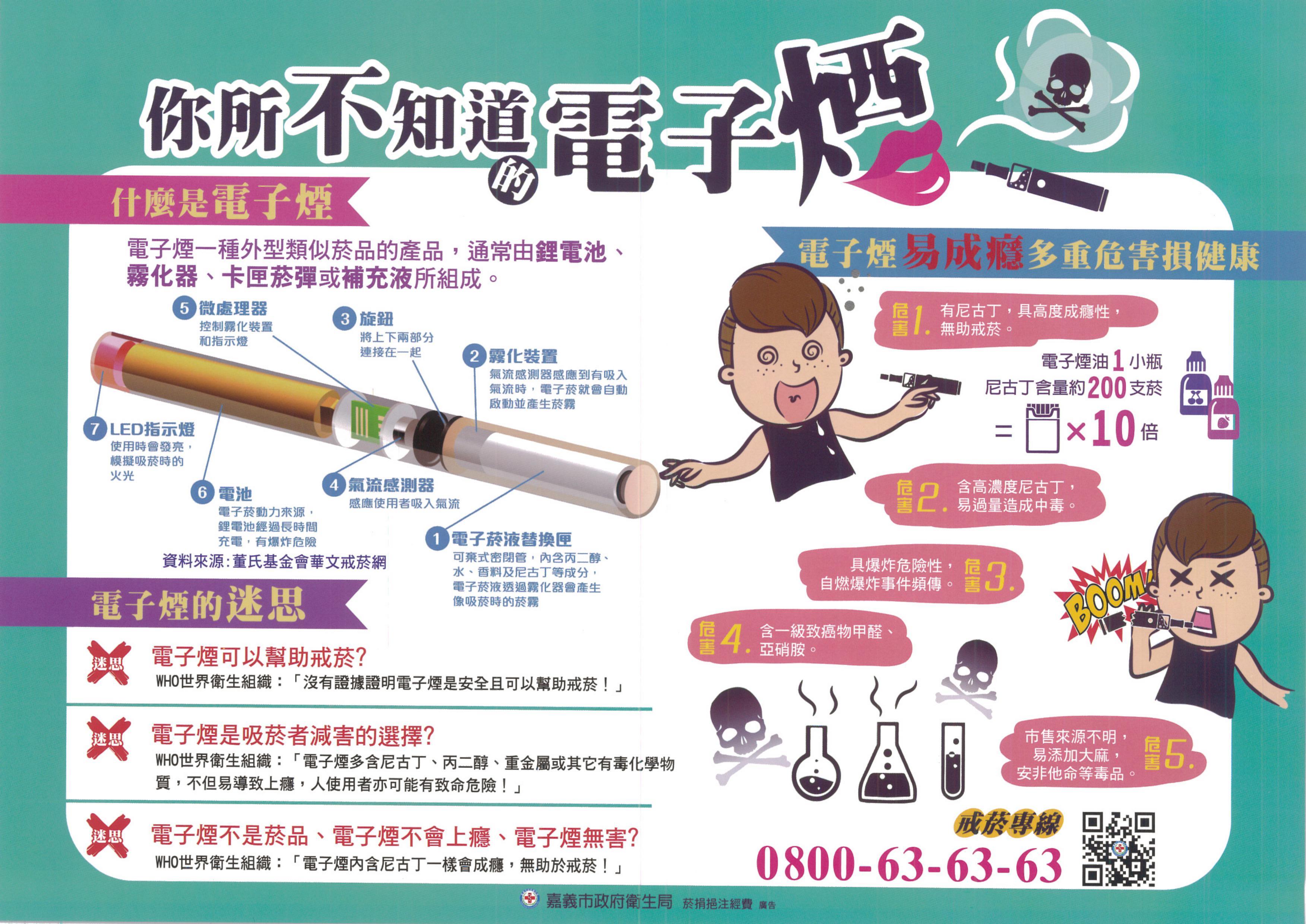 二、電子煙多含有尼古丁及有害致癌物,對使用者和暴露於二 手煙者都有害,更沒有證據證明電子煙是安全且可以幫助 戒菸。另外,國外研究顯示,曾經使用電子煙的青少年會 有較高的吸菸意圖,且易開始有吸菸行為,青少年若曾使 用過電子煙,其嘗試紙菸的機會是沒有使用過電子煙青少 年的2倍以上,雙重使用對身體危害更甚,且更難以戒 除。
