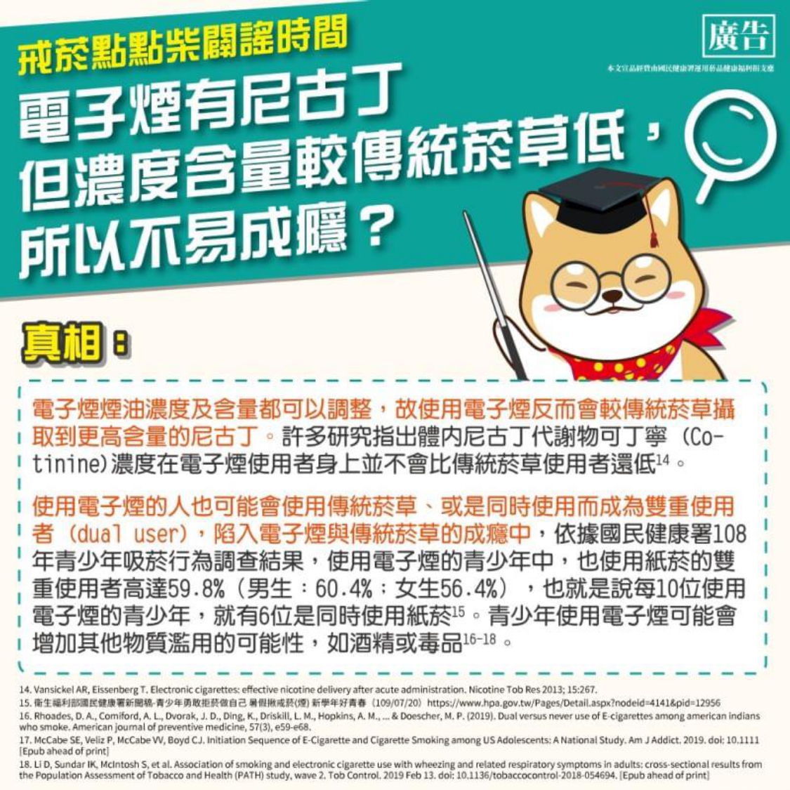 二、國健署已委託製作「菸害防制素養—教師版教學手冊」、 「國中生電子煙防制教學包」及「國小高年級學生菸害防 制教學包」,請協助向學生強化宣導禁止使用電子煙等違 法產品,培養正確菸(煙)害防制識能。